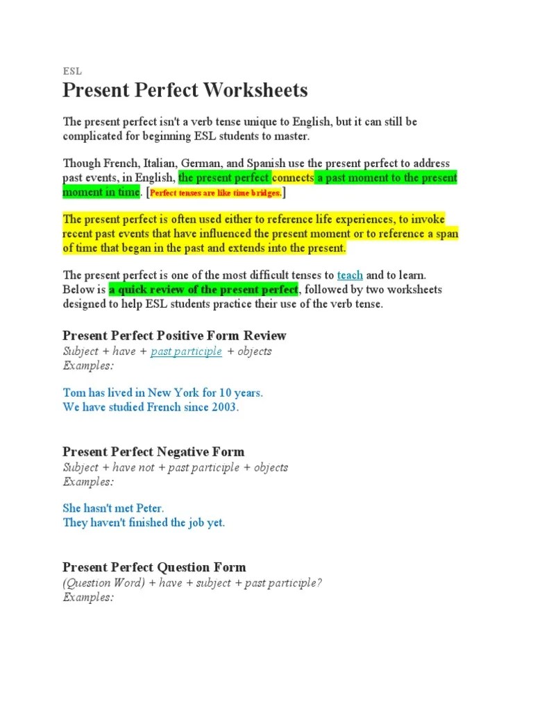 In these exercises, students rewrite sentences in the present perfect tense. Grade 4 grammar worksheet on the present perfect tense · have you ever been . · i've been here for five years. Grammar translation · how long have you known john? This is a present perfect exercise and worksheet for english language learners. · i haven't eaten yet. A collection of english esl worksheets for home learning, online practice, distance learning and english classes to teach about present, perfect, present . Present perfect worksheets for efl / esl teachers. Students answer the questions with their own ideas and using appropriate tenses. · i've never seen game of thrones. A great esl activity / activities booklet to reinforce your child's understanding of how to form the present perfect tense in english! Top of our list of present perfect games and activities is the classic esl activity 'find somebody who.'.